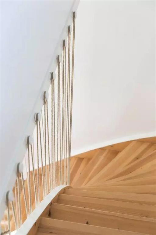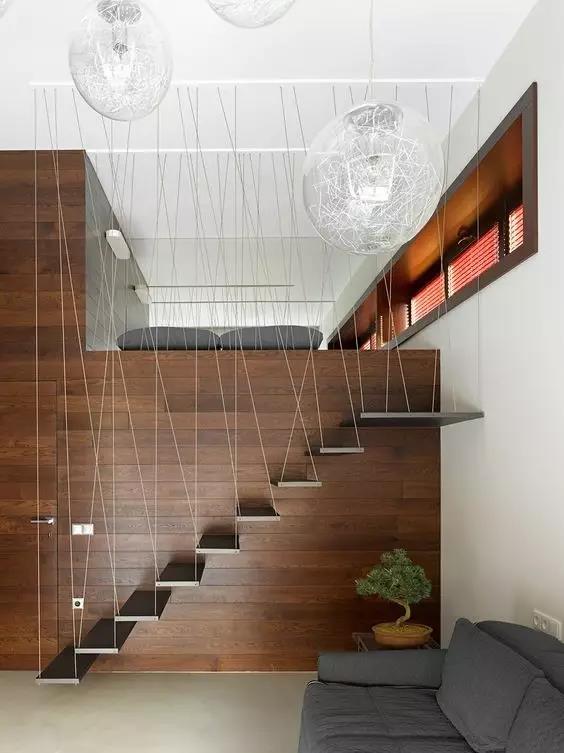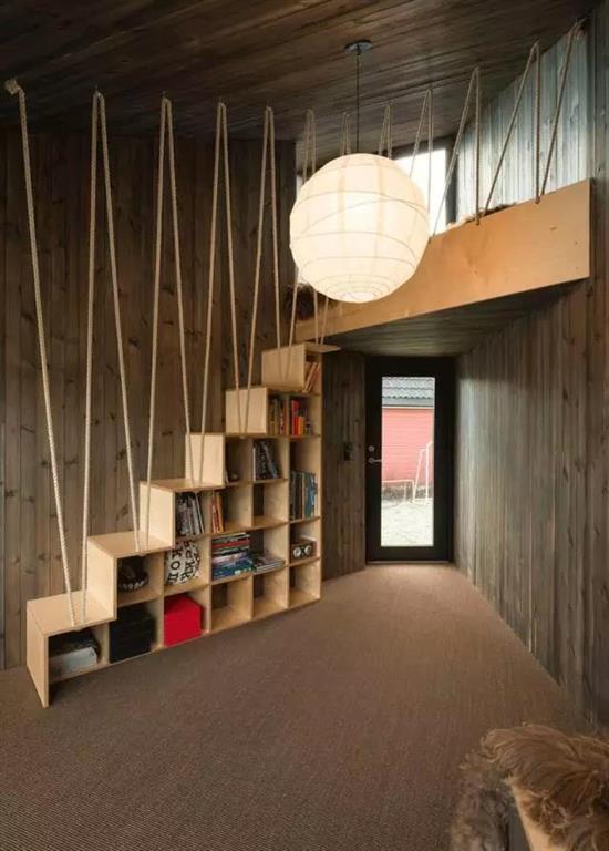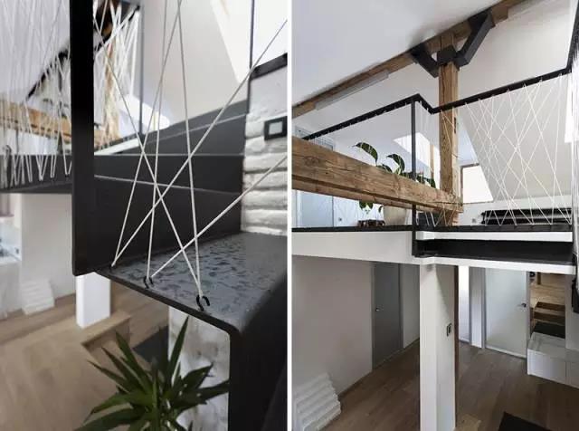 網(wǎng)狀護欄和木質(zhì)樓梯,親和力很強,非常適合有小孩的家庭。